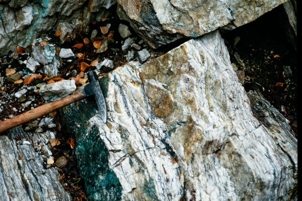 The Shear-Hosted Zone trenches exhibit quartz veining and sheared sedimentary rocks with locally very high-grade copper-gold-silver-lead-zinc mineralization.Five holes were drilled to test the vertical continuation of this surface mineralization in 1967.The best hole intersected 4.6 metres averaging 1.89% copper, 1.36 ounces of silver per ton, 0.84% lead, and 3.02% zinc.Gold was not assayed at that time, but subsequent sampling by Fortune identified grades up to 1.62 ounces per ton in selective grab samples.