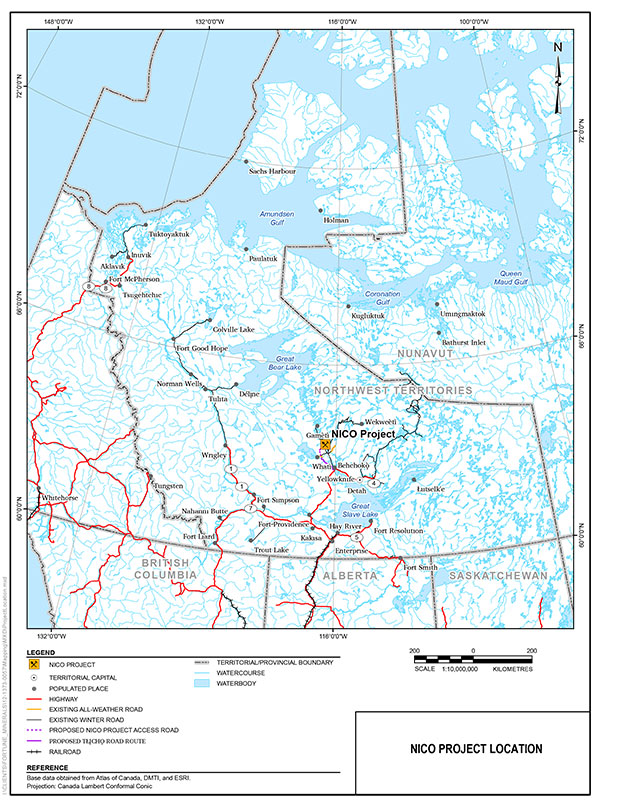 The NICO deposit is located in Canada’s Northwest Territories, within Tlicho Territory, approximately 160 km northwest of the City of Yellowknife and 50 km north of the community of Whati where the territorial highway system currently terminates in this area. The deposit is 22 km west of the Snare Hydro-Electric Complex and 400 road-km from the rail terminal at Enterprise, Northwest Territories. Current access to the NICO site is via a 10-km extension of the government ice road to the community of Gameti, or by fixed wing or rotary aircraft from Yellowknife. Fortune plans to construct a 50 km long spur road from Whati to the mine for construction and operations. The road will enable concentrates from the mine to be trucked to Enterprise for transfer to rail and delivery to the Alberta Refinery for downstream processing.